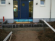 Pflastersteine der Firma Klostermann Umrandung Eingang: GARDA®line Palisaden anthrazit Fläche Eingang: CASADO®fino Platten opal-weiß Zugangsbereich: Ökopflaster geoSTON® plus / umweltfreundlicher, offenporiger, wasserdurchlässiger Pflasterstein.
